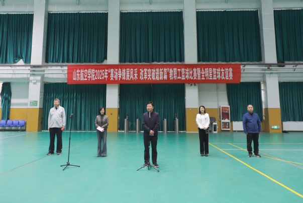 为深入贯彻全民健身国家战略,赋能校园文化蓬勃发展,激发教职工队伍凝聚力与奋进活力,10月23日,山东航空学院2025年“赛场争锋展风采 改革突破谱新篇”教职工篮球比赛暨全明星篮球友谊赛在砺学综合馆正式拉开帷幕。党委委员、副校长宫新军出席开幕式并为比赛开球,工会负责人主持仪式。赛事组委会全体成员,各参赛代表队领队、教练、全体运动员,教师及学生代表参加了开幕式。